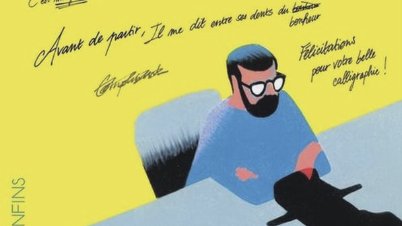 L’élu est une œuvre également atypique d’un point de vue visuel. Dans un style que je qualifierais de dépouillé, les couleurs sont très franches, marquantes et retranscrivent bien l’ambiance de chaque scène : le bureau, une sortie au cimetière, … Sans être complétement fan de ce style (notamment des personnages), il y a certaines scènes qui accrochent tout de même l’œil ! De manière régulière, le récit est entrecoupé par une page manuscrite qui consiste en une sorte de story-board des scènes que le lecteur vient de lire. Comme une mise en abyme de la création que sont en train de réaliser les deux auteurs.
